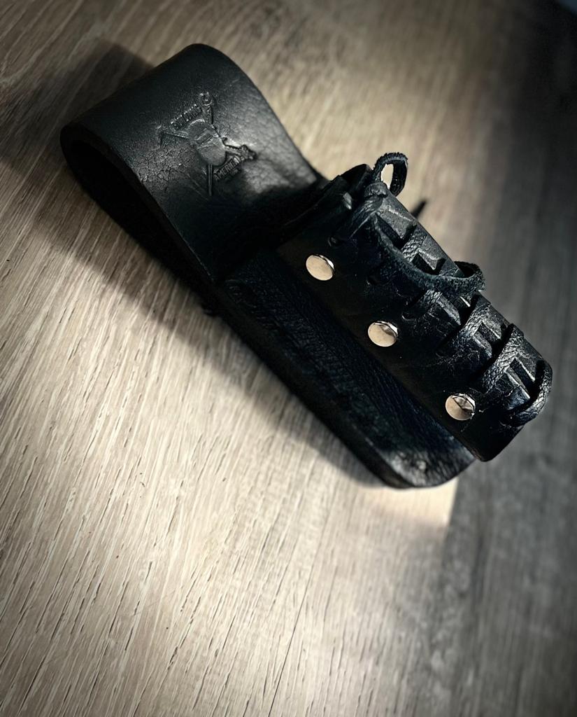 Handcrafted crescent bullpin holder. Made from 9-11oz reinforced Latigo leather. Very sturdy. Will fit up to 2.5" tool belts. Holder has an insert to prevent bullpin from hanging up on lacing upon insertion. It has eight eyelets with 10oz Latigo leather lacing for adjustment. Leather is stitched with heavy duty 207 thread. Leather and lacing color may vary depending on where it was cut from the hide.